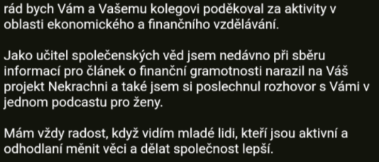 To ho inspirovalo k založení projektu Nekrachni, který staví na nezávislých a kritických informacích. Kromě vzdělávací mobilní appky se věnuje také workshopům ve školách nebo ve firmách.